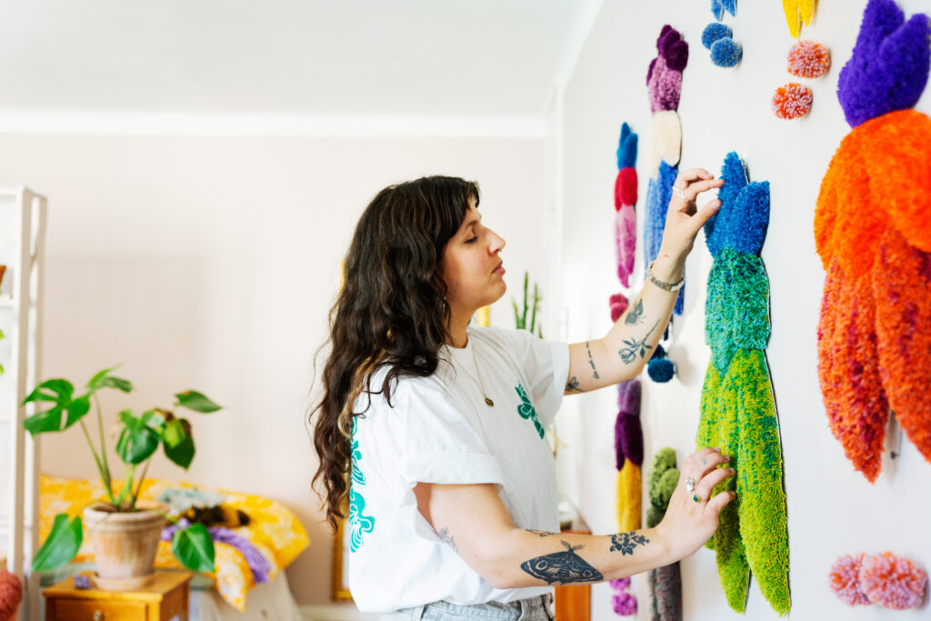 – Det börjar ofta med en känsla eller en tanke – som i mitt examensarbete, där jag inspirerades av min mormors porslinsmålningar och min farmors virkade överkast. Jag målade illustrationer som en kärlekshälsning till dem, och utifrån det utvecklade jag mönster. Sen skissar jag – tills jag hittar en form jag gillar. Därefter börjar jag tänka praktiskt: hur ska den hänga, hur funkar den rent tekniskt? Färgerna är något jag alltid tänker på men sparar till i efterhand, beroende på vad jag har tillgång till. Ibland tar garnet slut mitt i – då får man improvisera. Jag jobbar mycket med ”fake it ‘til you make it”.