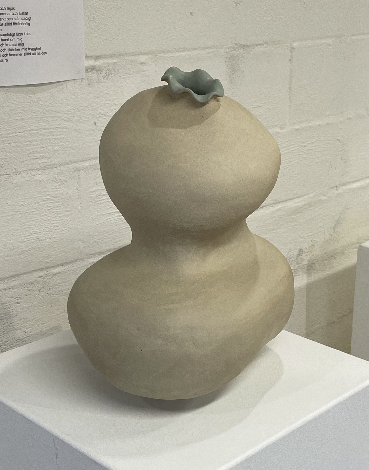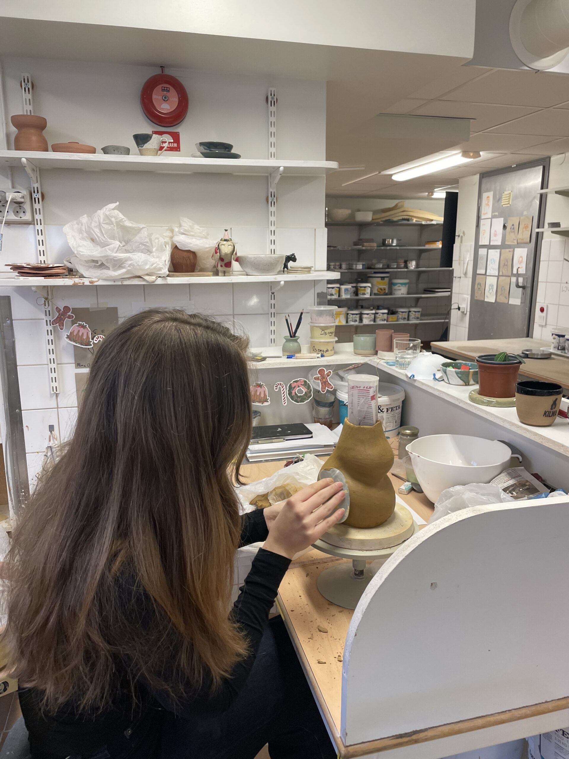 Det var dock inte alltid lätt. Prestationsångest fick mig att tappa lusten för kreativitet under tonåren och gymnasiet. Efter studenten tog jag ett sabbatsår då jag jobbade men främst försökte jag hitta tillbaka till glädjen i skapandet. Under den tiden upptäckte jag keramiken, som snabbt blev en passion. Det var som att hitta hem. Jag började med en kvällskurs via Medborgarskolan, och efter att ha hyrt in mig i en verkstad sökte jag till utbildningen på Löftadalens folkhögskola där jag också bor på deras internat. Mina studier vid Löftadalens folkhögskola ger mig möjlighet att experimentera och utveckla mitt skapande. Vi har otroliga lärare som skapar en trygg och inspirerande plats att utväxlas i. I utbildningen har vi temaperioder, men det finns gott om tid att fördjupa sig i egna projekt. Framför allt med keramiken – den kräver tid och fokus för att utvecklas tekniskt. Det är en omvälvande upplevelse, där jag lärt mig att släppa perfektionismen och skapa mer intuitivt.