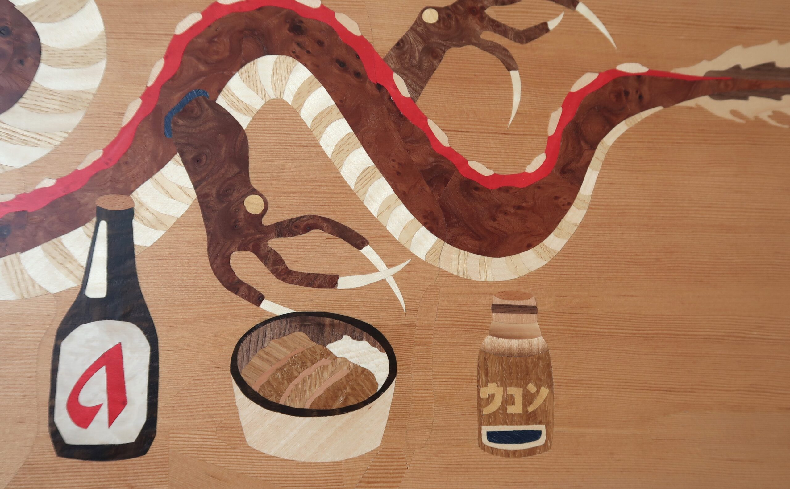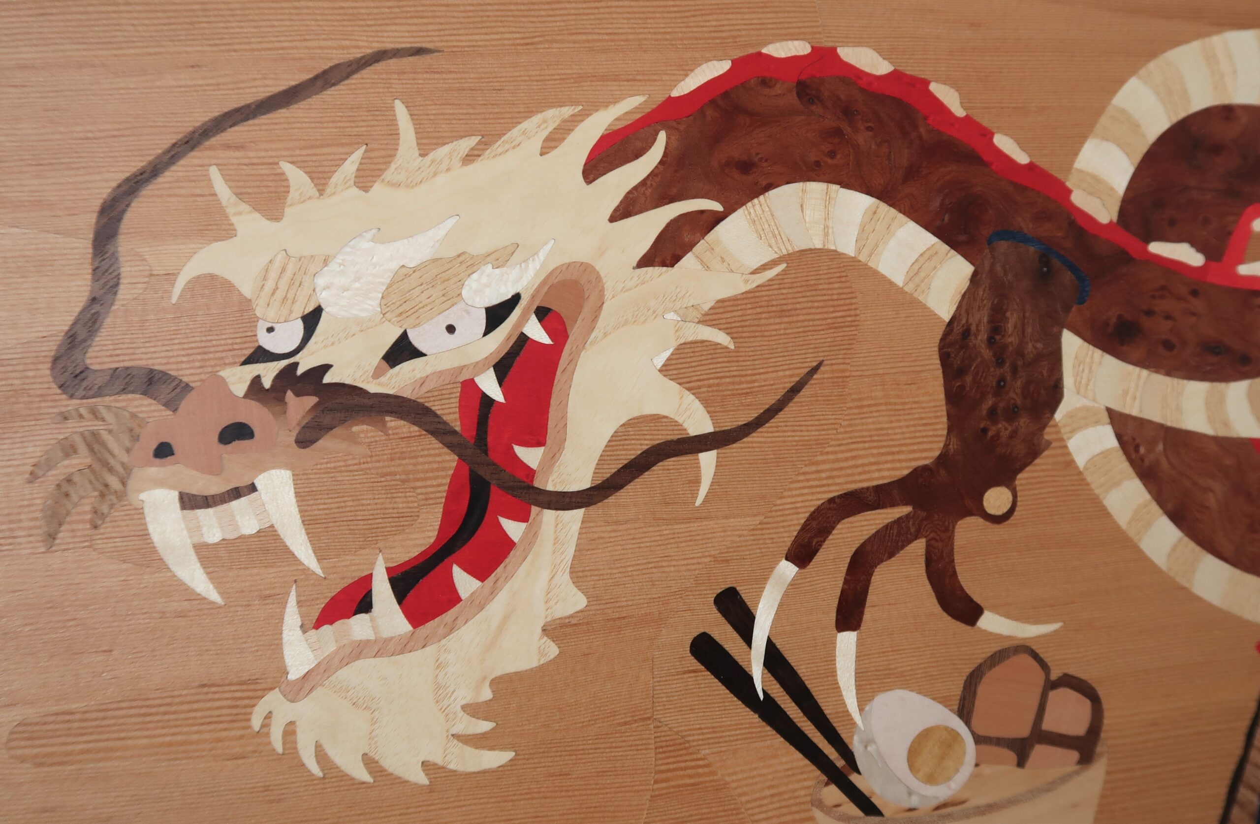 Intarsiatavla föreställande en japansk drake samt några favoritprodukter från Japan. Blandade fanér.