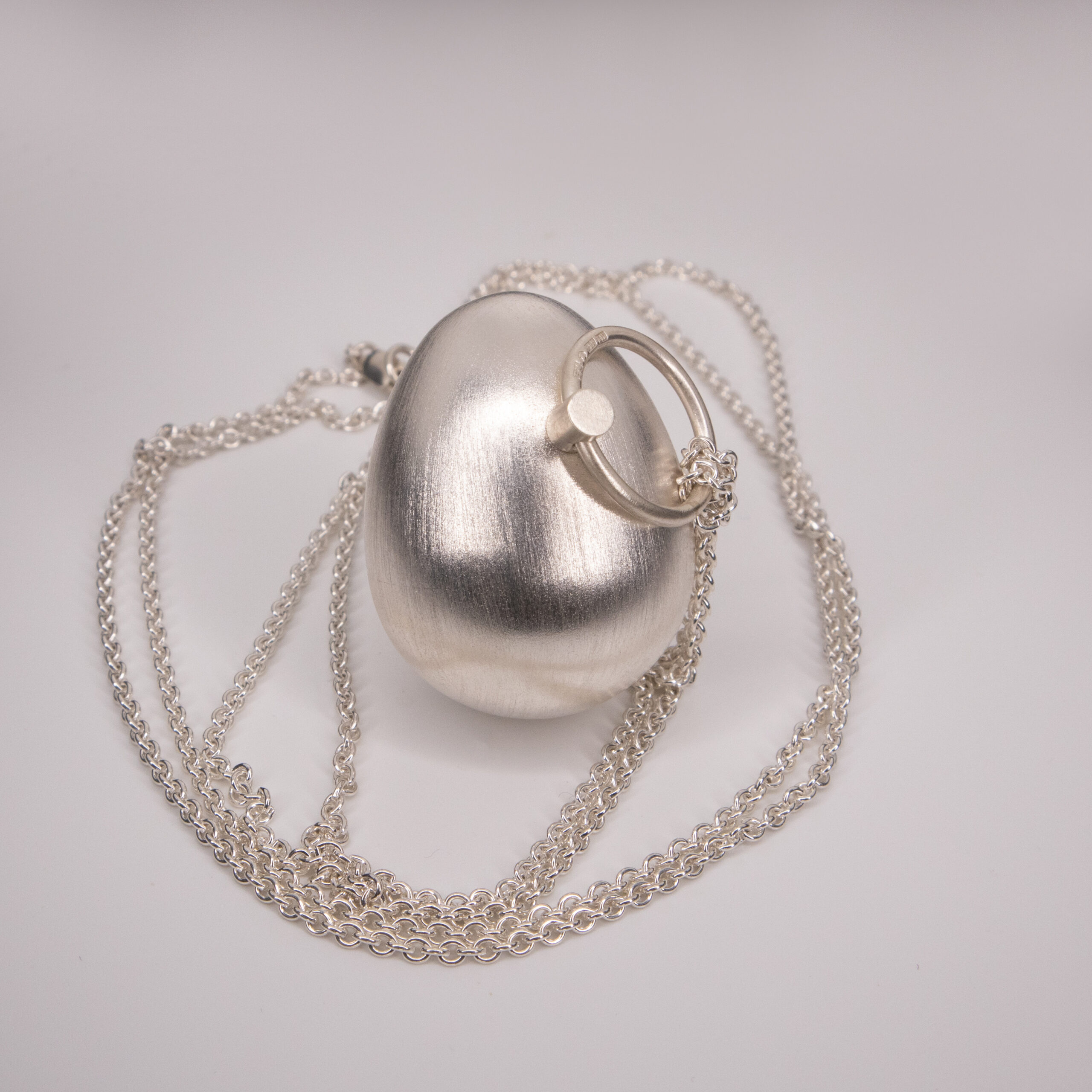 Rytmägget är ett unikt, handgjort smycke som även fungerar som ett bärbart instrument. Ägget innehåller små silver kulor som skapar ett mjukt och rytmiskt ljud vid rörelse, likt en maracas. Halsbandet skapades som en del av ett projekt där jag utforskade ljud och smycken. Perfekt för den som vill bära med sig en rytmisk dimension – oavsett om det är för avslappning, meditation eller som ett uttrycksfullt inslag vid ett framträdande.