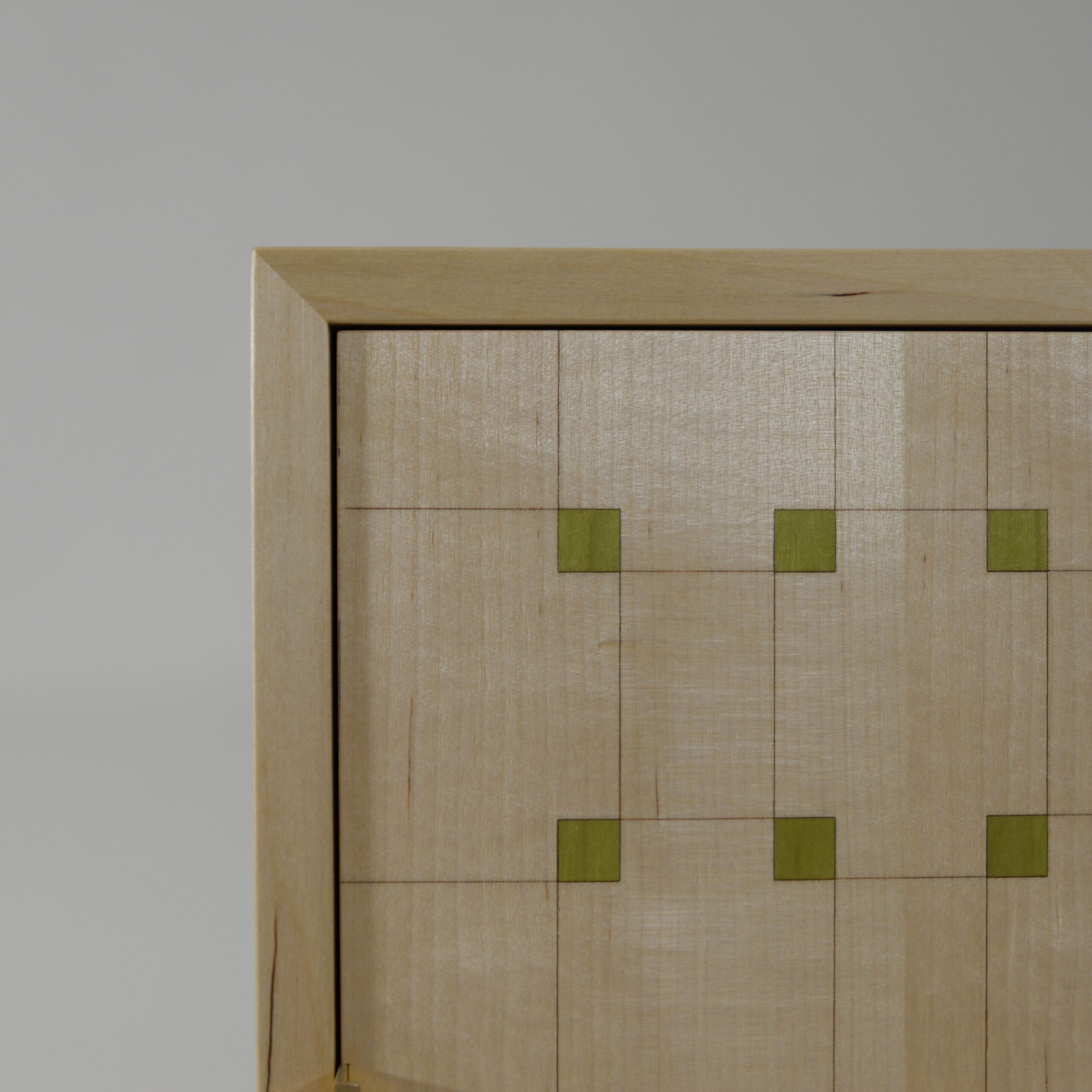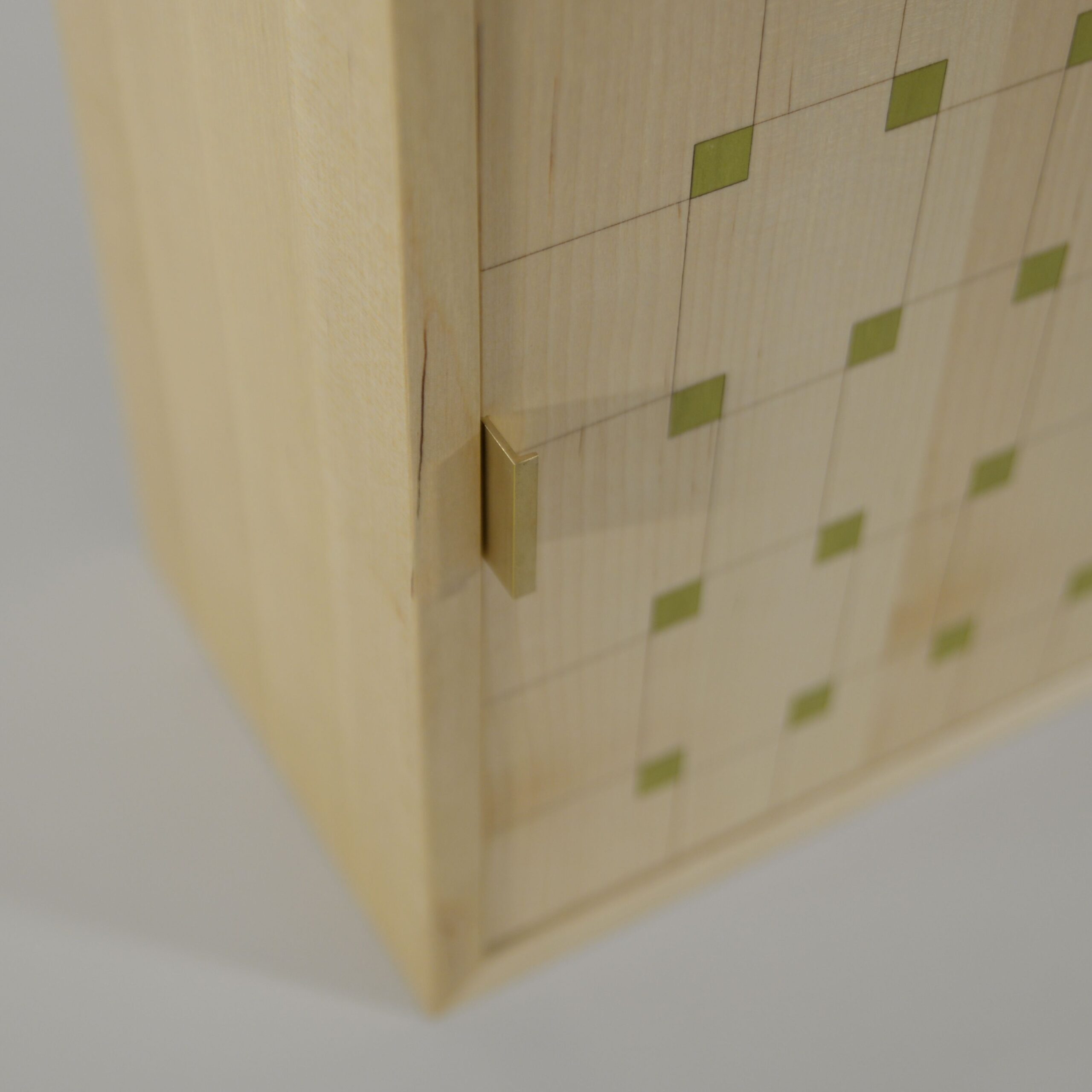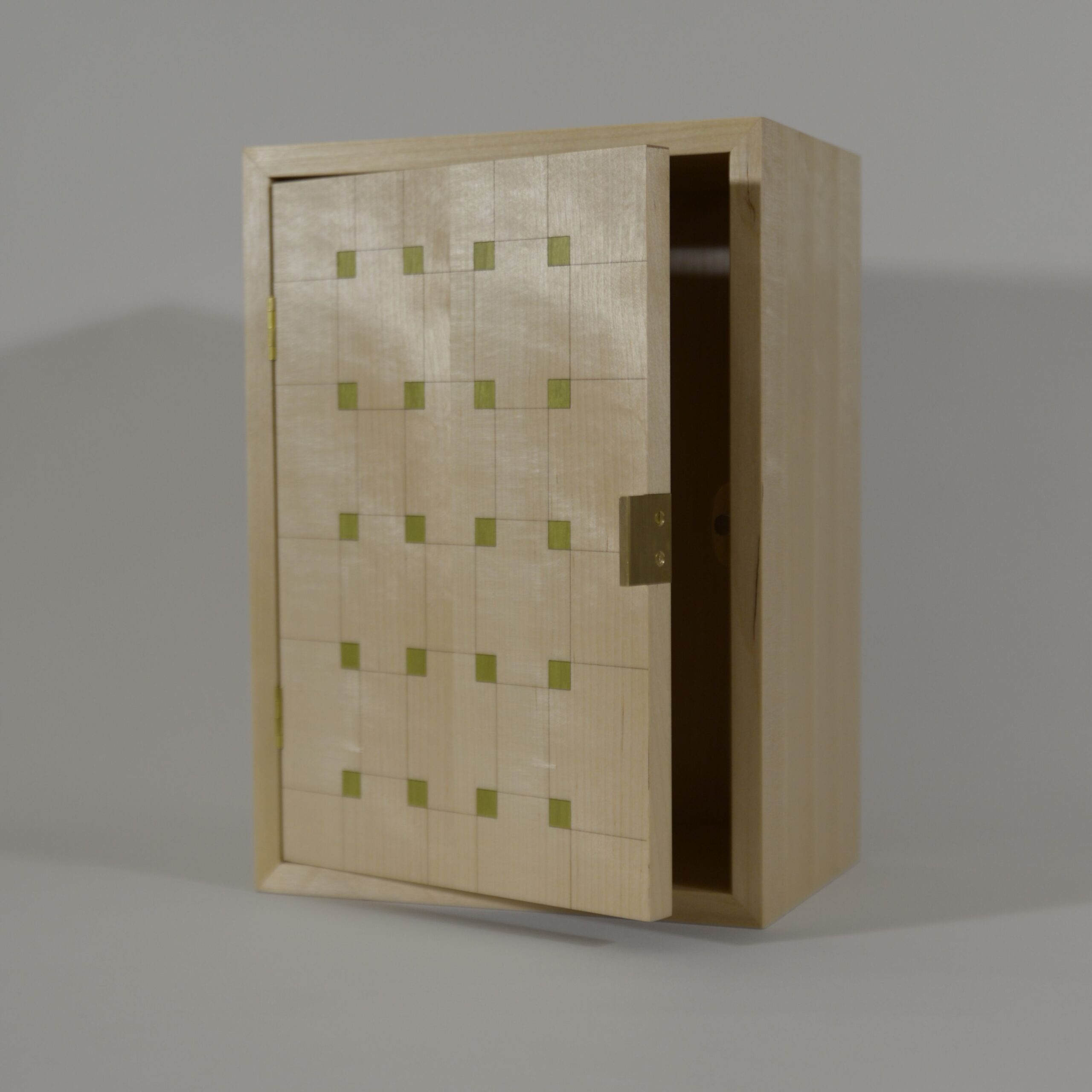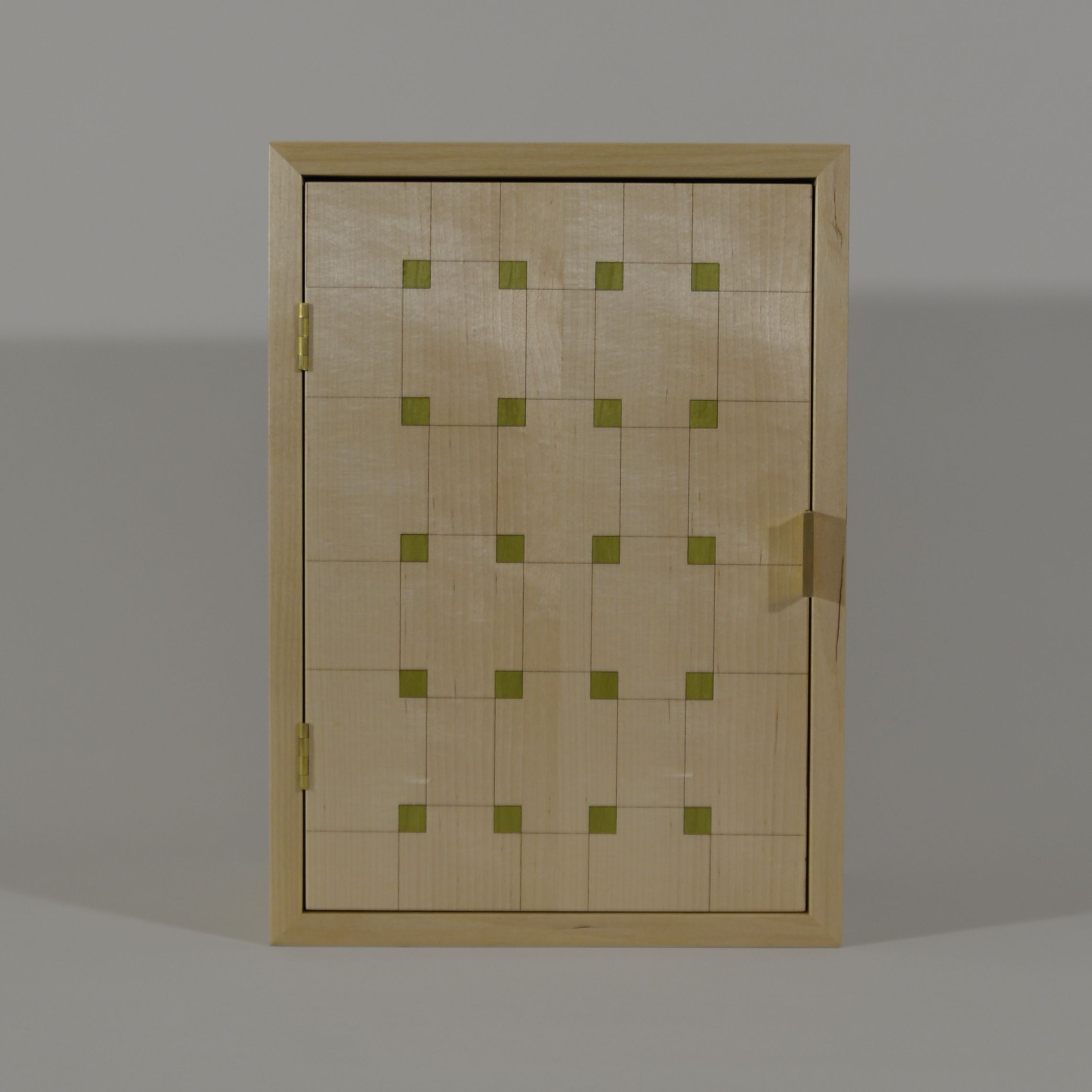 Skåpet som är i björk kan hängas på vägg eller ställas i en hylla. Dörren är en fanerad lamellskiva med innanförliggande kantlister. Mönstret på dörren är en kombination av lasergravering och intarsia. De gröna rutorna är infärgad grön fanér. Gångjärn och handgjort handtag är i mässing. På skåpets baksida är fyra hängbleck infällda åt olika håll så att skåpet blir vändbart utfrån hur man vill öppna dörren.